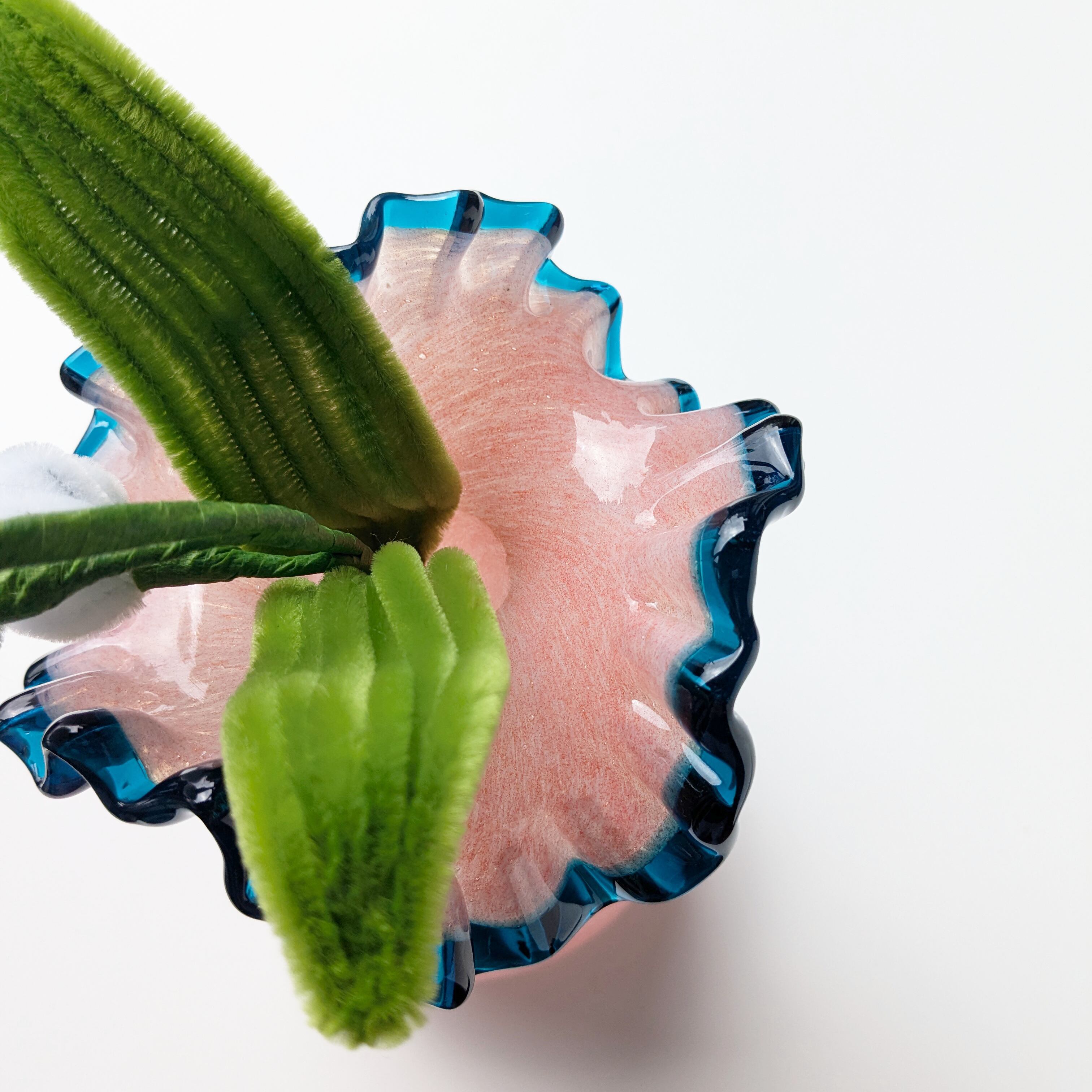 まん丸な形とフリルのように広がる口、ピンクとネイビーの組み合わせにときめくデザインです。