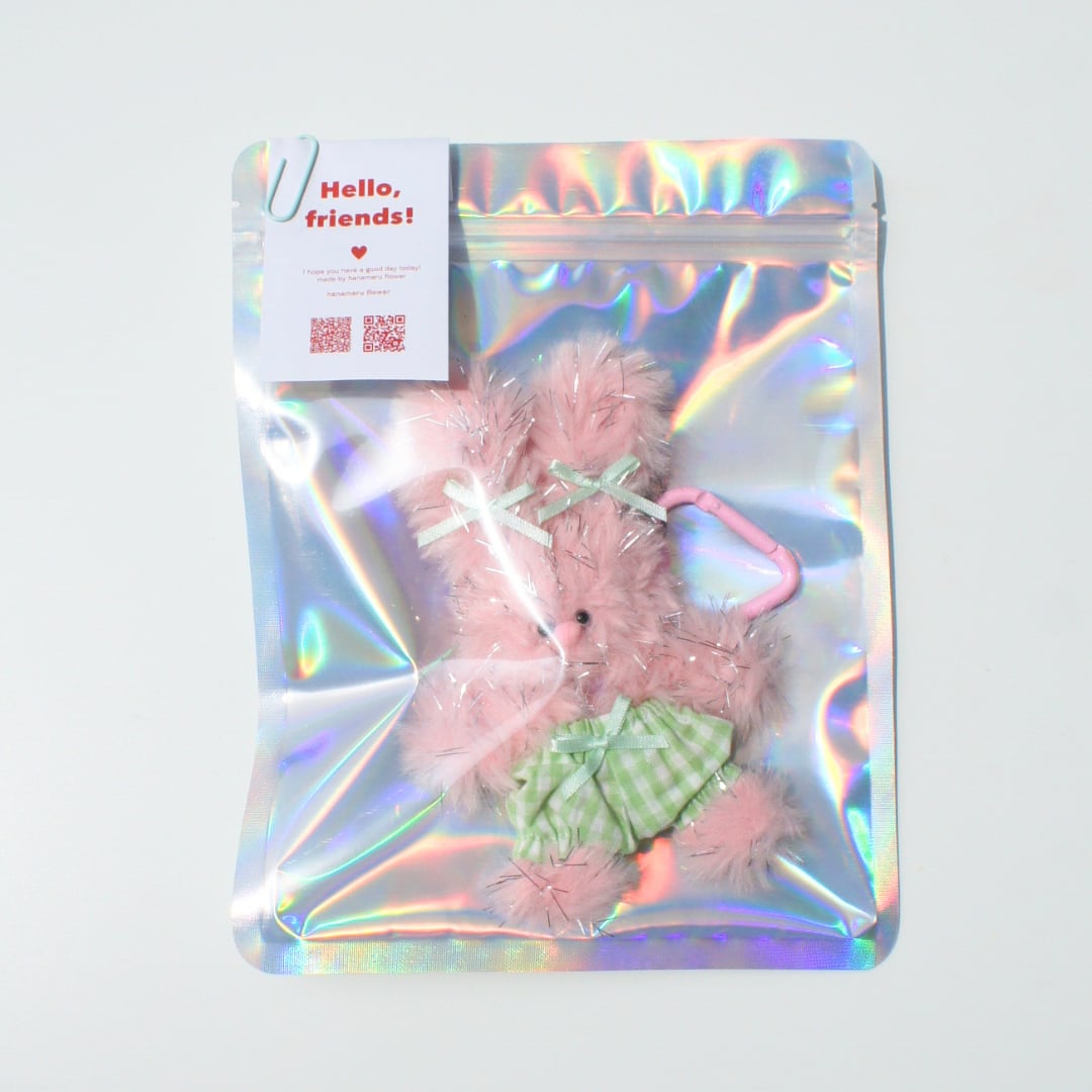 キラキラが編み込まれたふわふわのモールに、緑のリボンとパンツがチャームポイントです。