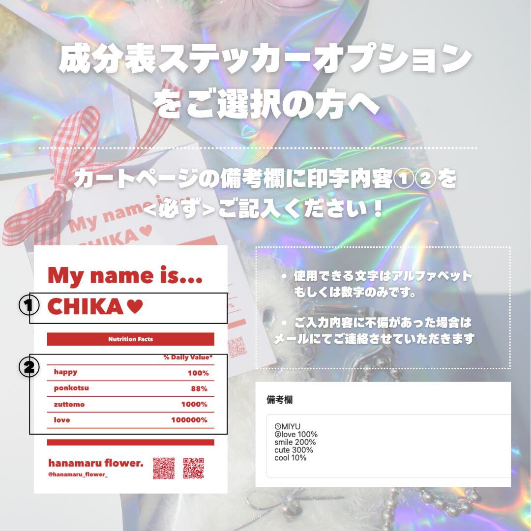 成分表ステッカー付きのパッケージをお選びいただきましたお客様は、<<<備考欄に必ず以下の事項を全てご記入いただきました上で>>>ご購入をお願いいたします。
