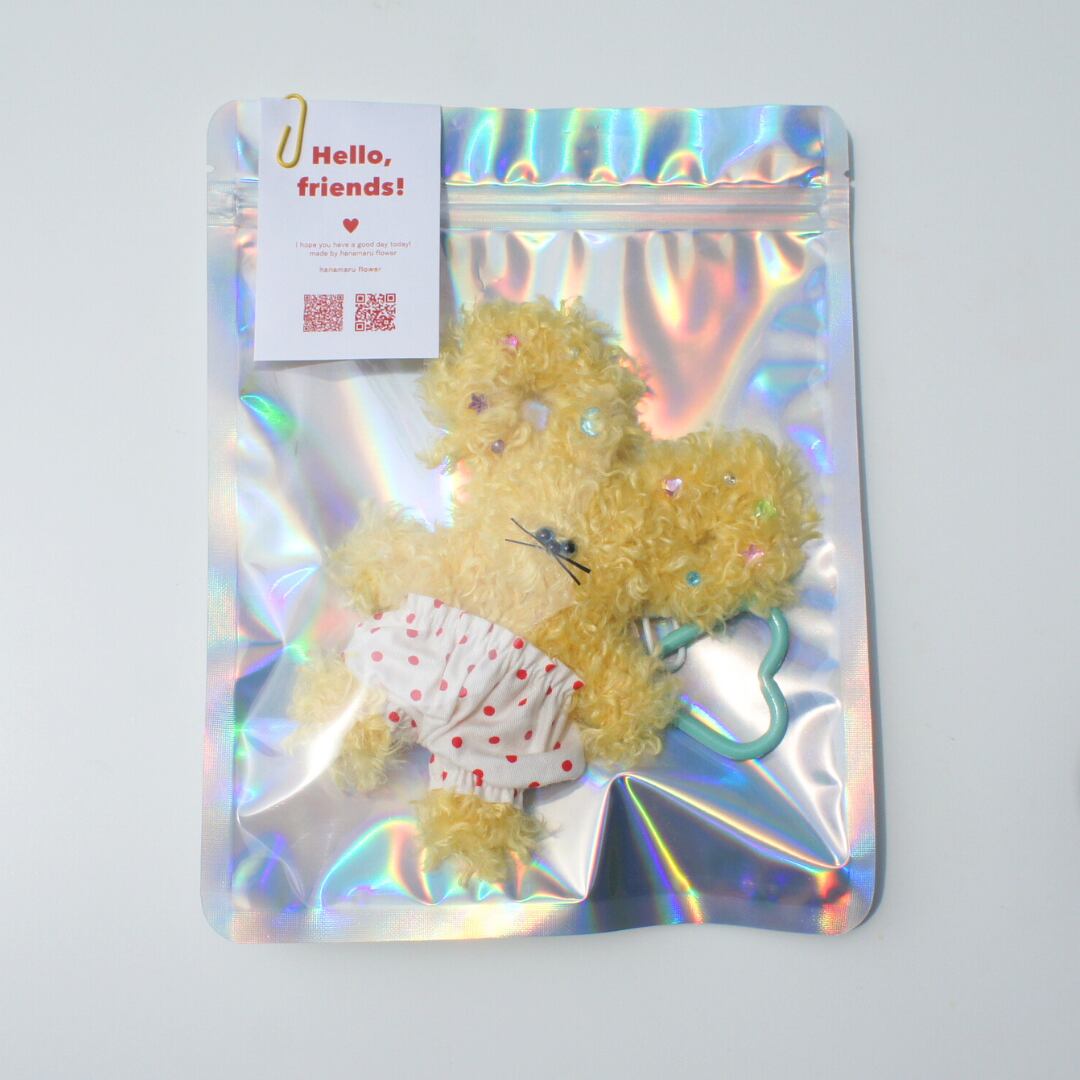 耳にあしらったカラフルなキラキラと、ポップな柄のパンツがキュートなデザインです。