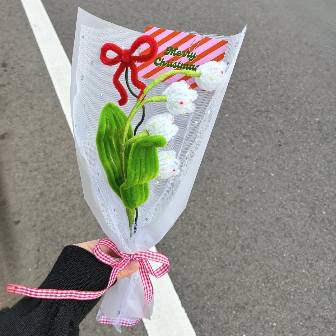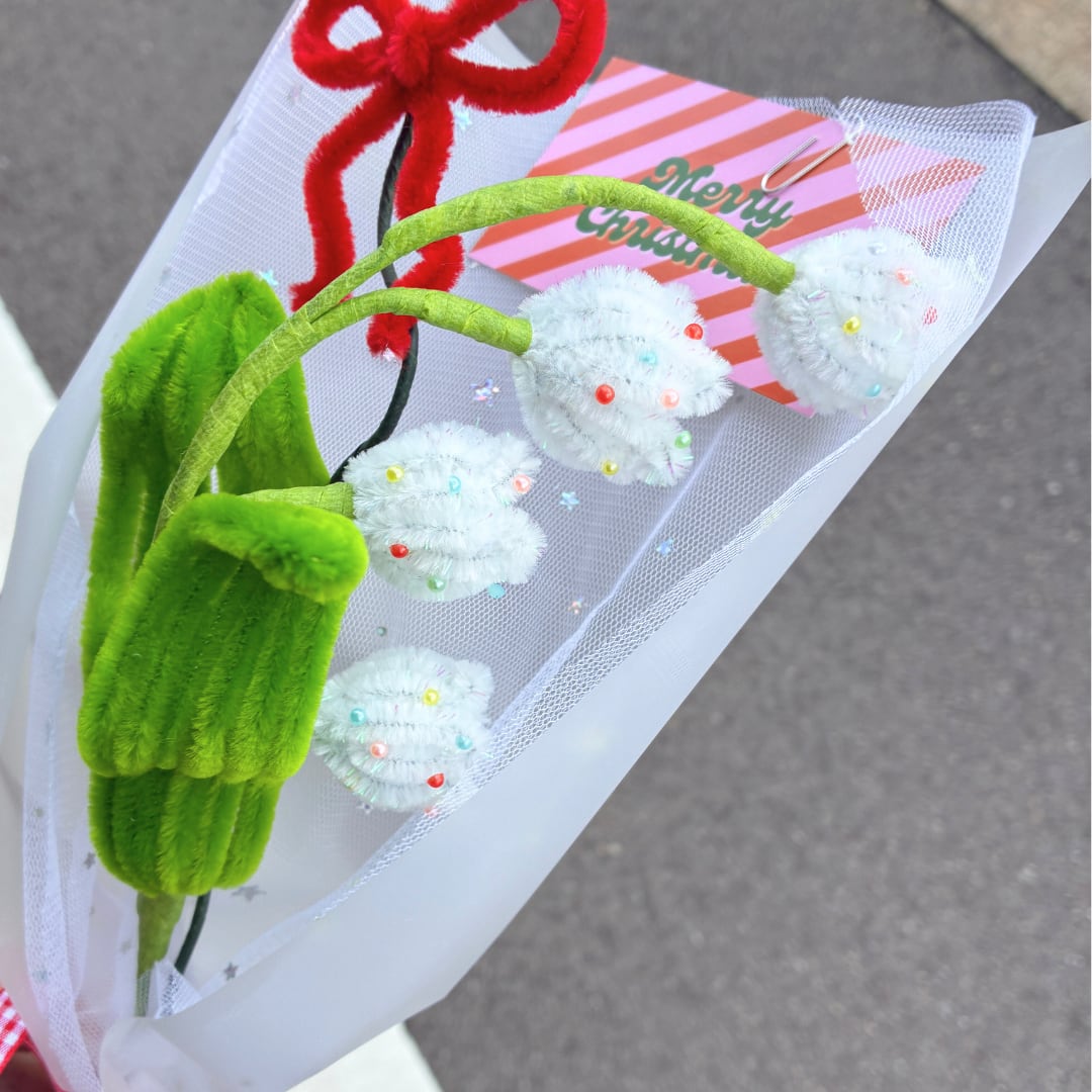 カラフルなパールをあしらったポップなスズランとリボンのミニブーケ。ホリデーシーズンのワクワク感を盛り上げる可愛いギフトです。