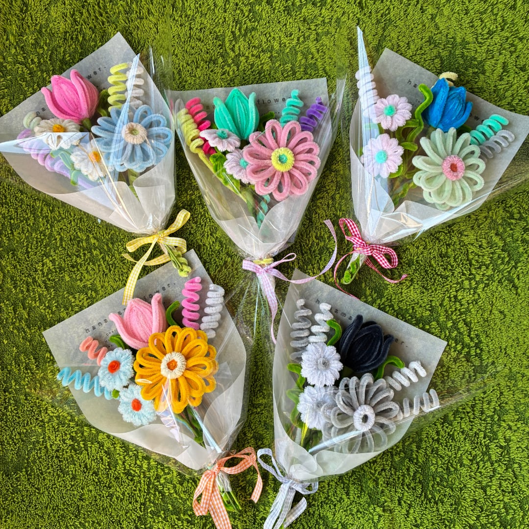 お花・くるくるは全て海外から取り寄せたこだわりカラーのモールで1つ1つ丁寧に手作りしている1点ものです。