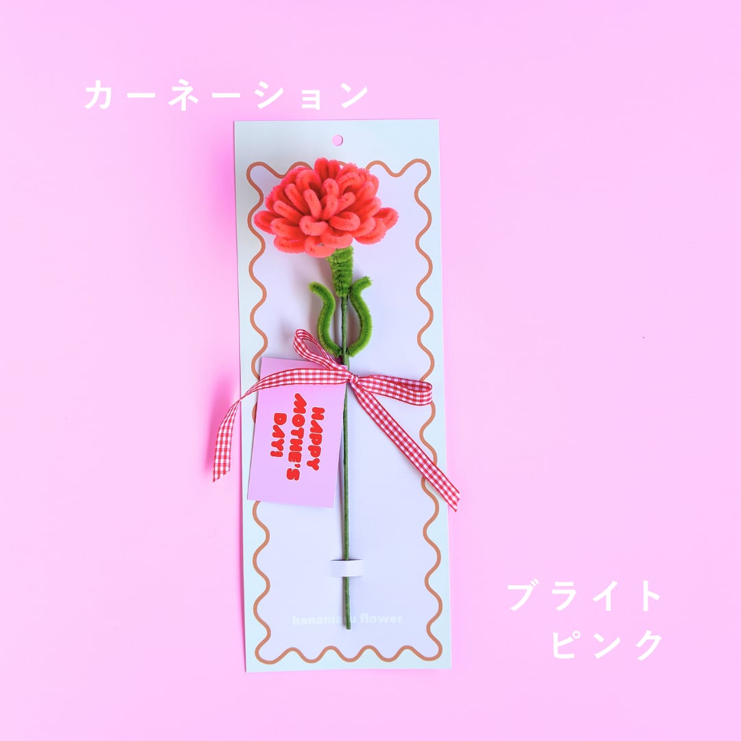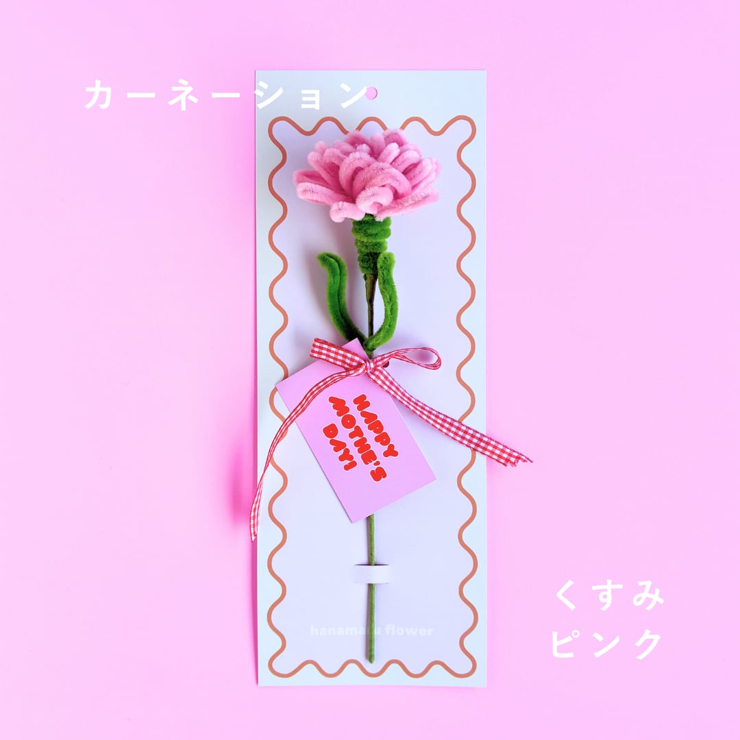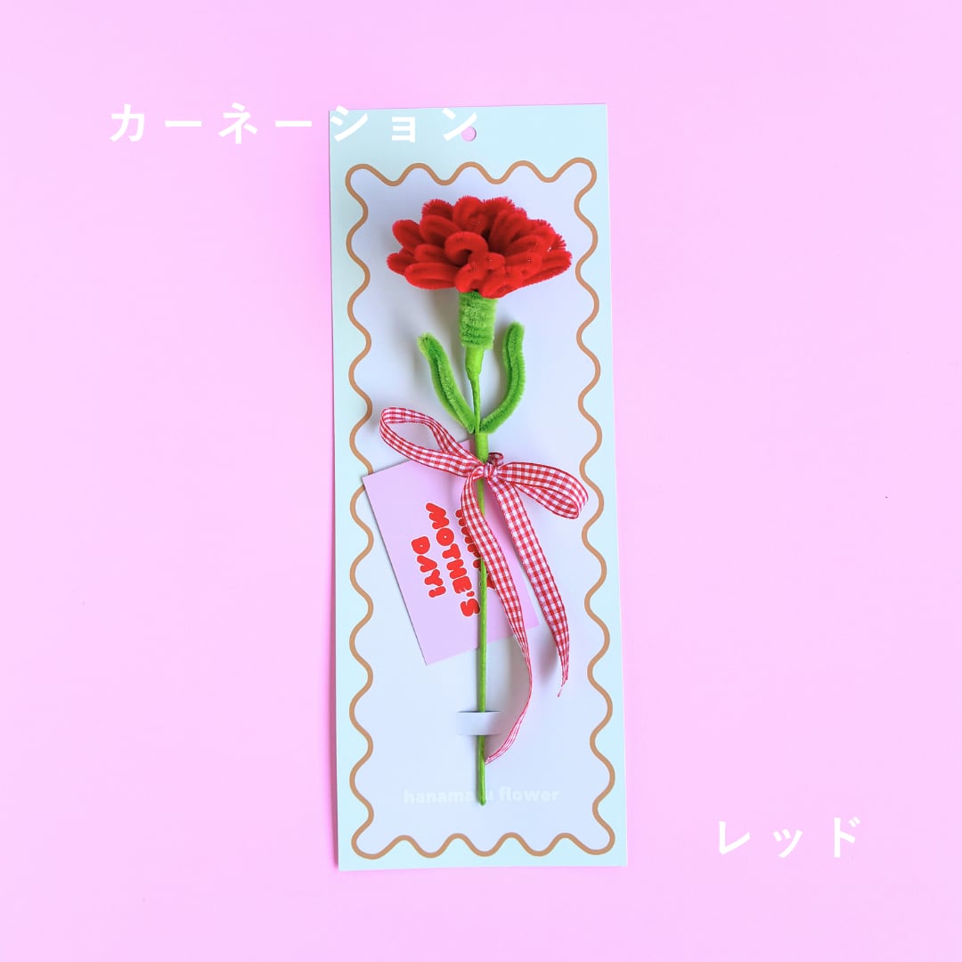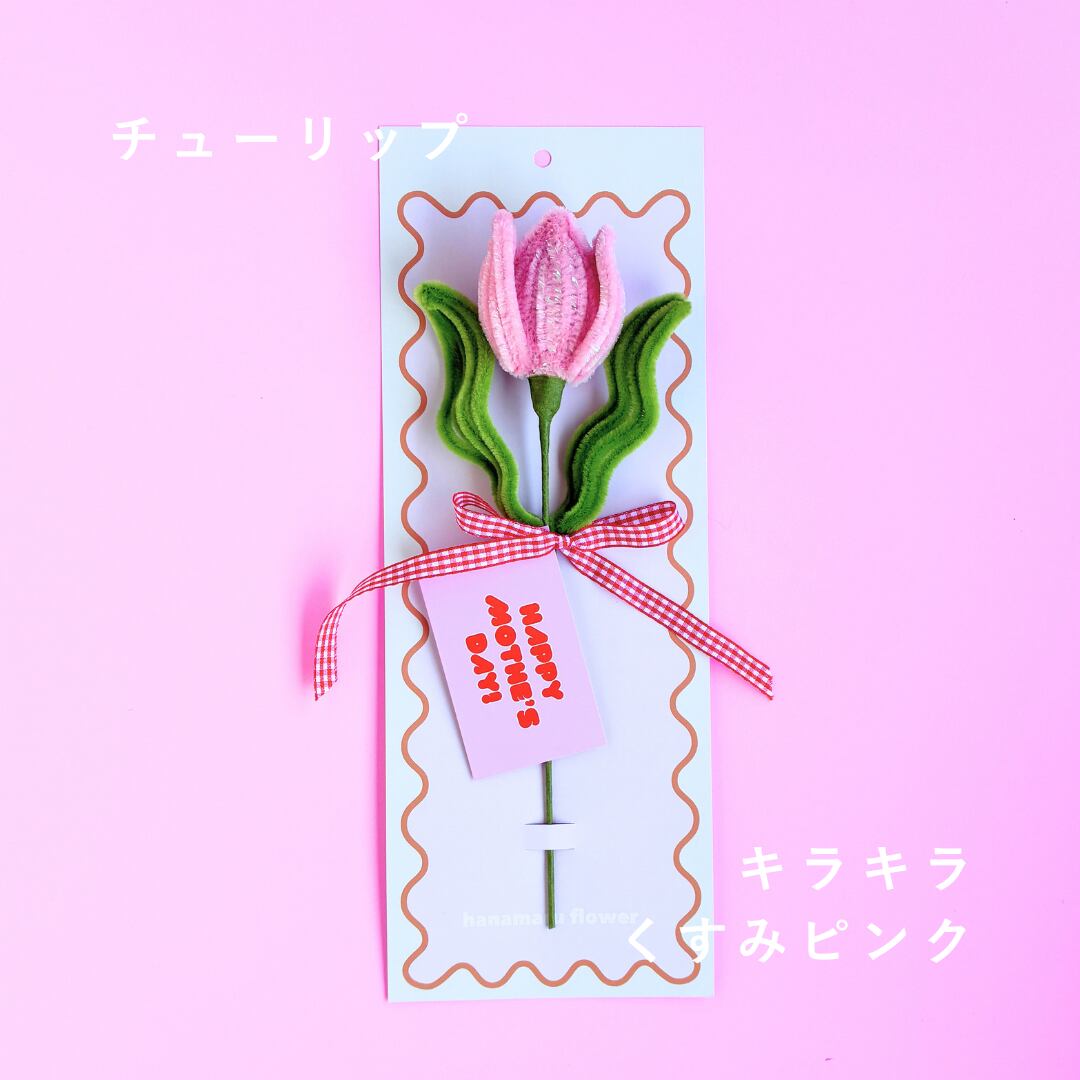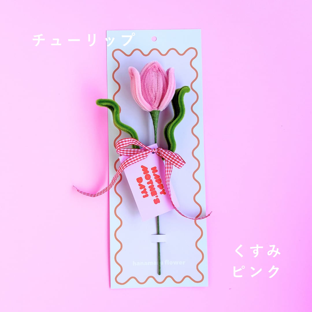 ふわふわ素材のカーネーション・チューリップを、オリジナルデザインの台紙とリボン、メッセージカードでおめかししました。
