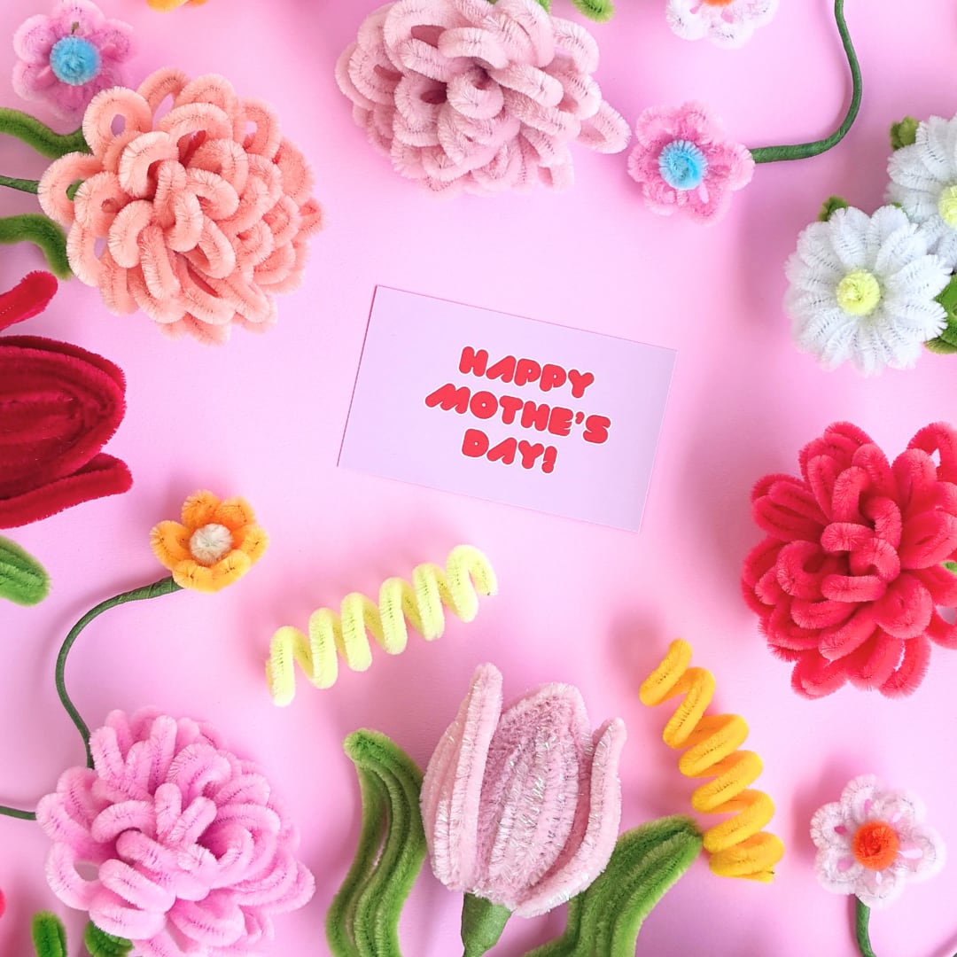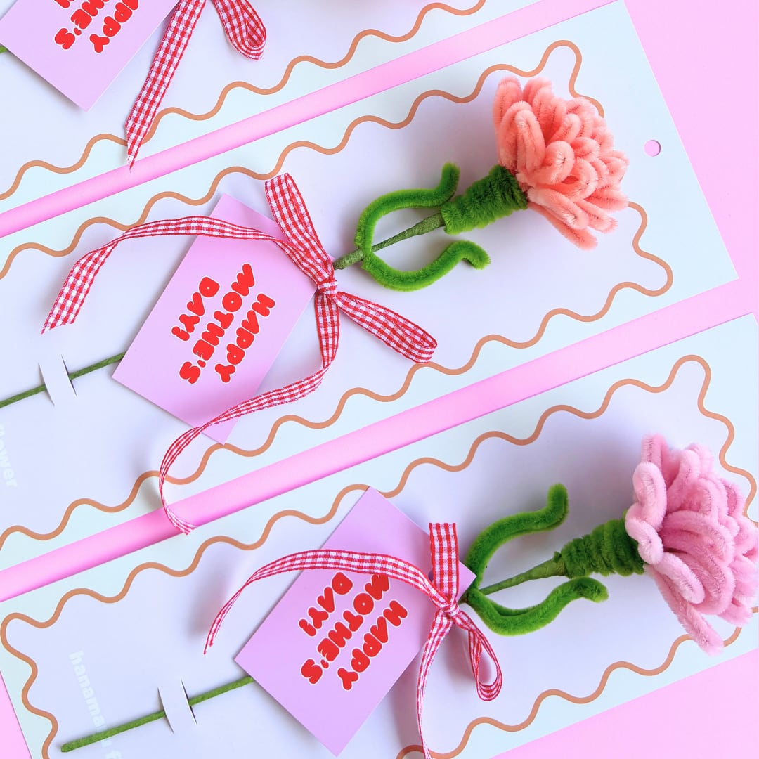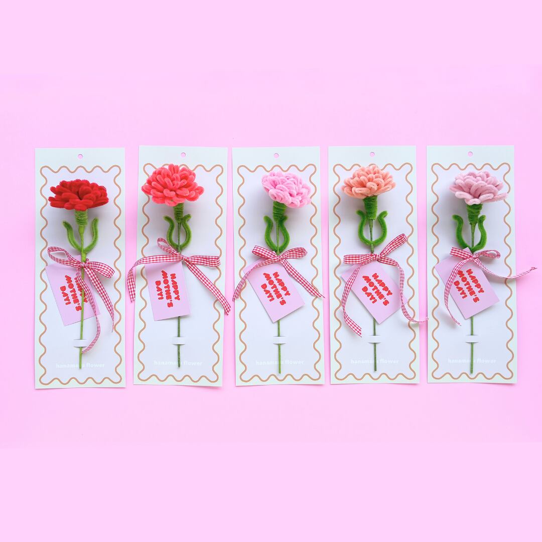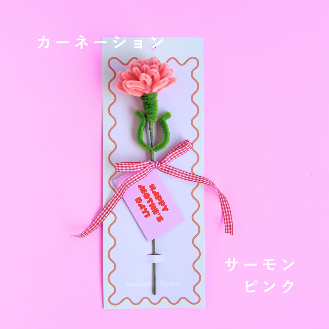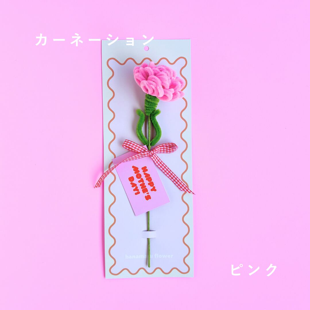 ふわふわ素材のカーネーション・チューリップを、オリジナルデザインの台紙とリボン、メッセージカードでおめかししました。