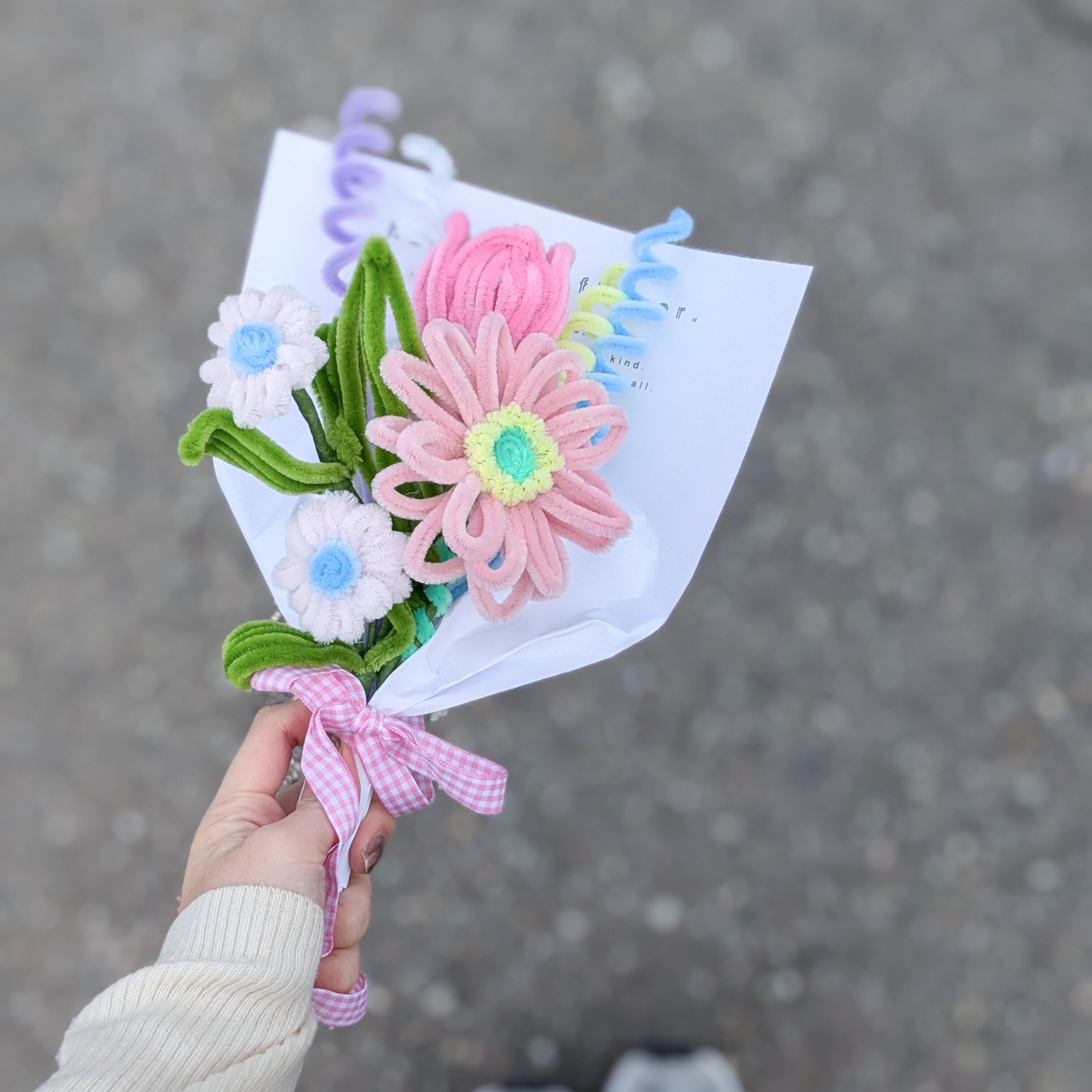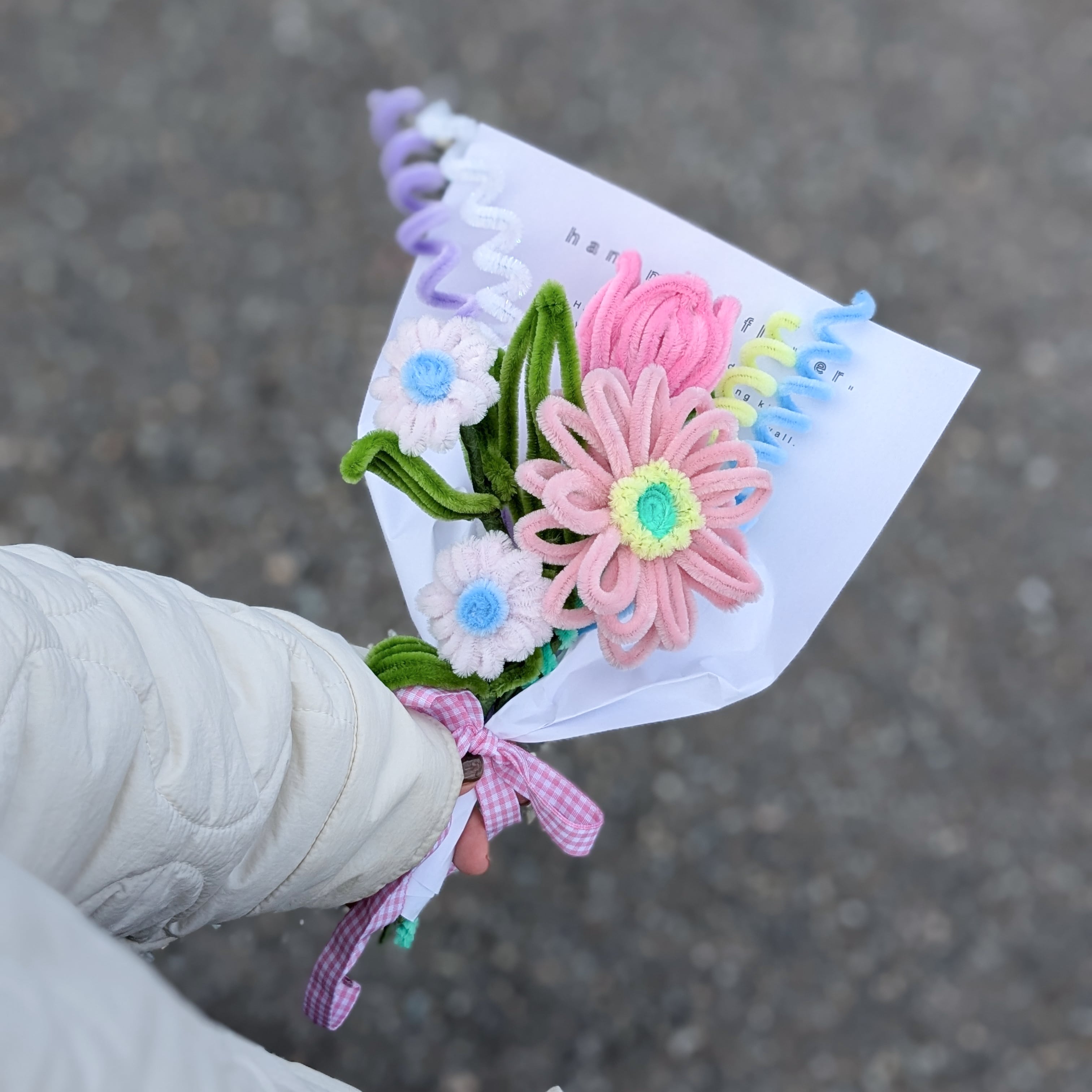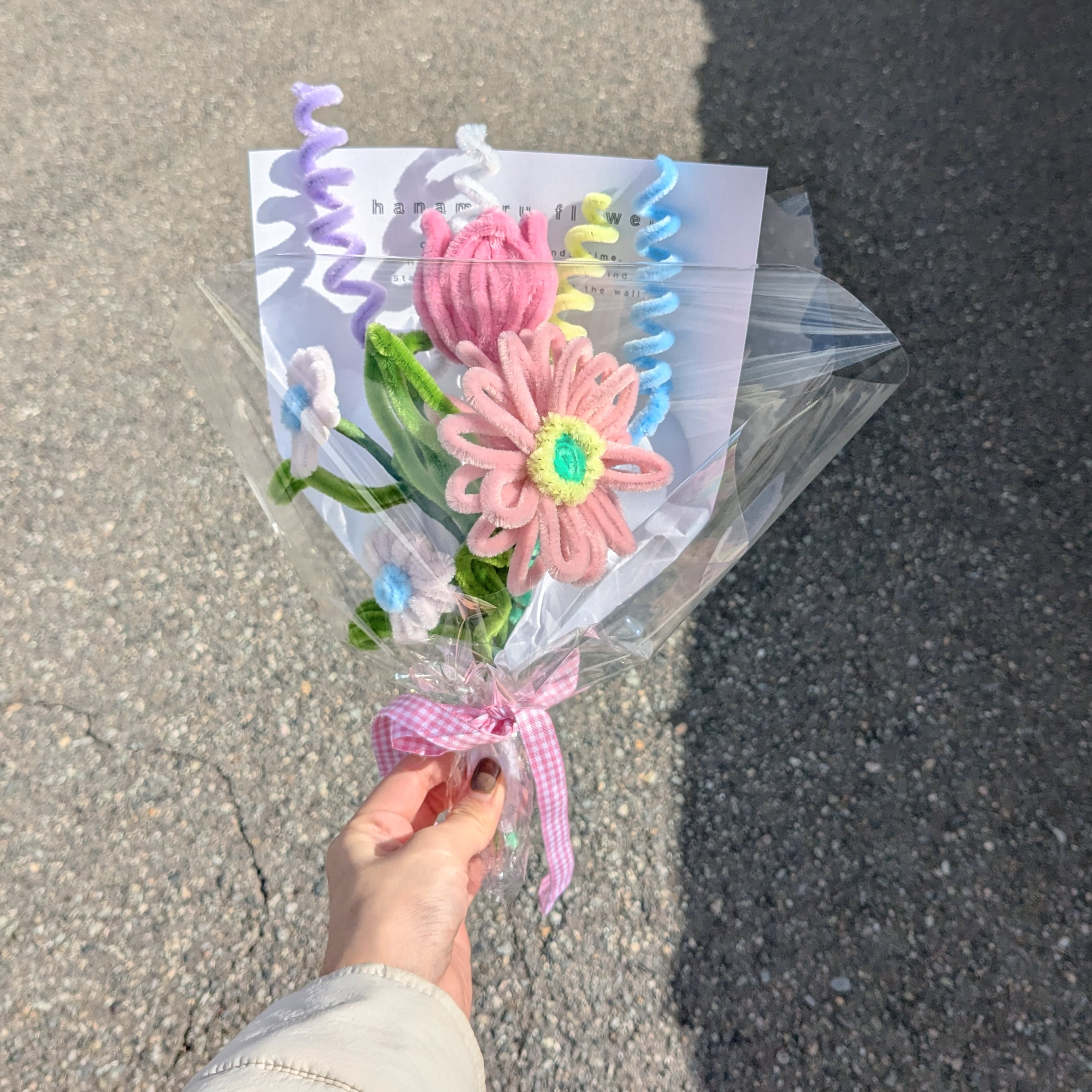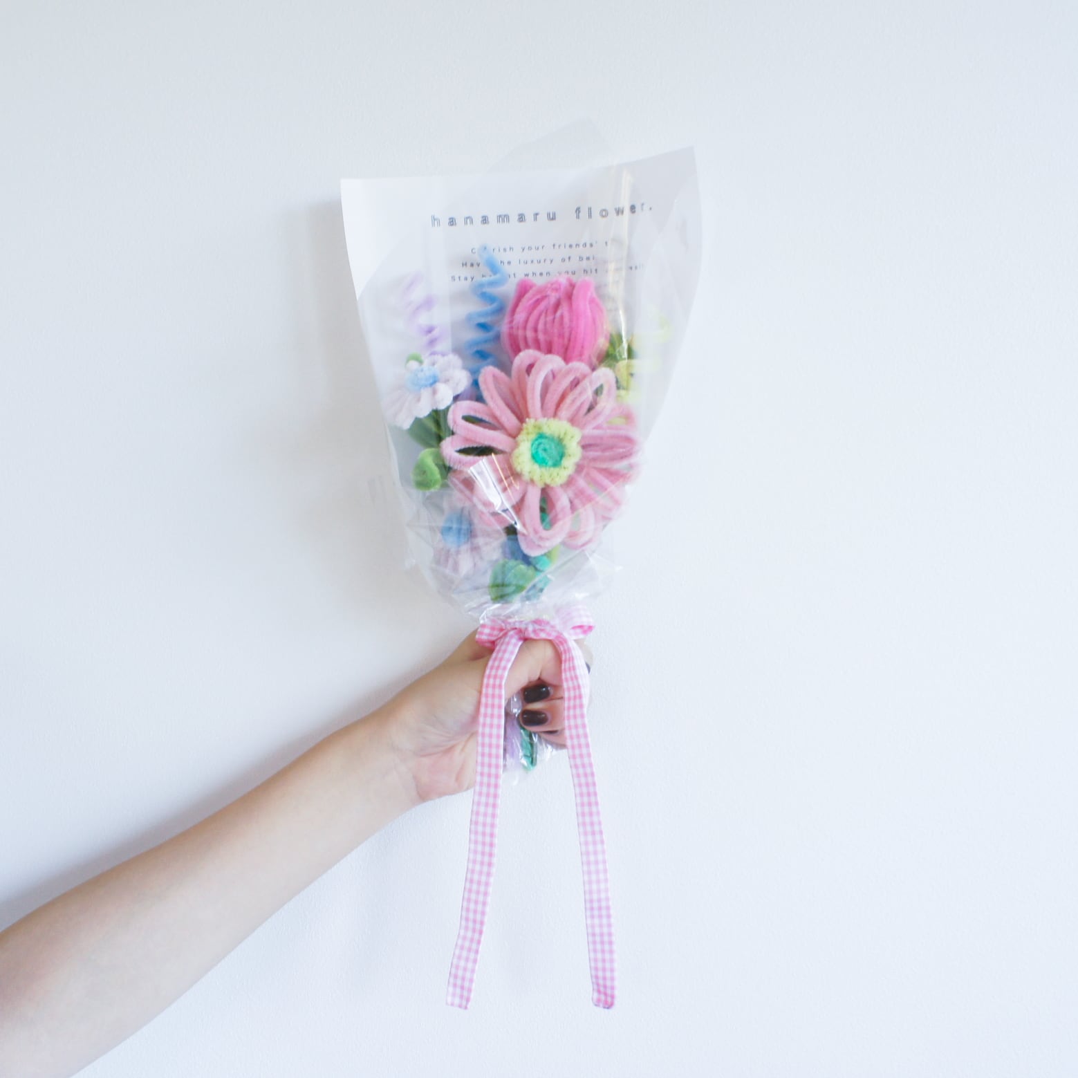 海外から取り寄せたこだわりカラーのモールで1つ1つ丁寧に手作りしている1点ものです。